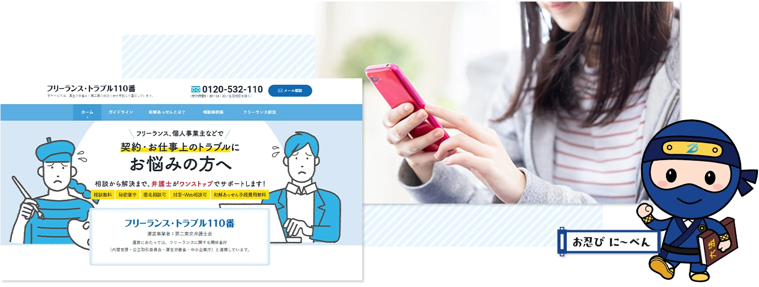 最近では、フリーランス・トラブル110番、弁護士子どもSNS相談、女性による女性のための相談会(アウトリーチ)などにも取り組んでいるよ。