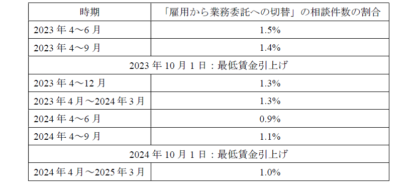 しかし、当会が厚生労働省の委託を得て運営する「フリーランス・トラブル110番」事業における相談傾向を見ると、最低賃金を引き上げることにより業務委託やフリーランスへの切替え事例が増加する傾向は読み取れない。「フリーランス・トラブル110番」は、業務委託を受けて業務に従事するフリーランスから電話やメール等での弁護士無料相談に応じている。その中で、「雇用から業務委託への切替」の相談は、2023年4~6月の3か月間の相談の1.5%22を、同年4~9月の6か月間の相談の1.4%を23、それぞれ占めている。しかし、同年10月1日に全国で最低賃金が一斉に大幅に引上げられた後のデータを見ると、同年4~12月の9か月間、同年4月~2024年3月の1年間では1.3%とむしろ減り24、2024年4~6月の3か月では0.9%とさらに減少している25。2024年10月1日に再度全国で最低賃金が一斉に大幅に引上げられた前後のデータを見ても、2024年4~9月の6か月間では1.1%である一方26、同年4月~2025年3月の1年間では1.0%とむしろ減っている27。したがって、フリーランスへの切り替えの懸念は、最低賃金引上げを妨げる理由にはならない。