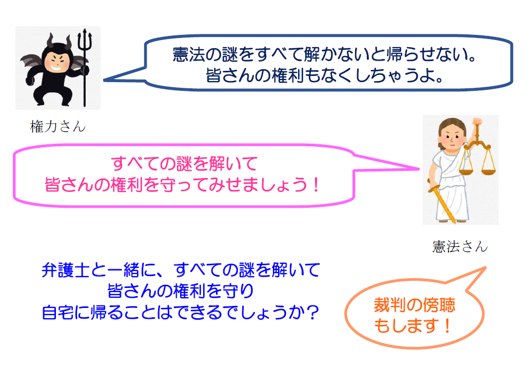 謎解きの後は、当会の憲法問題検討委員会の弁護士が、権力分立・司法権の独立、違憲審査権、裁判の公開、三審制、国民主権、基本的人権(表現の自由、個人の尊重、思想良心の自由、学問の自由、居住移転の自由、法の下の平等、人身の自由)、平和主義、弁護士の役割、弁護士自治などをテーマに、謎解きの答え合わせと解説をしました。