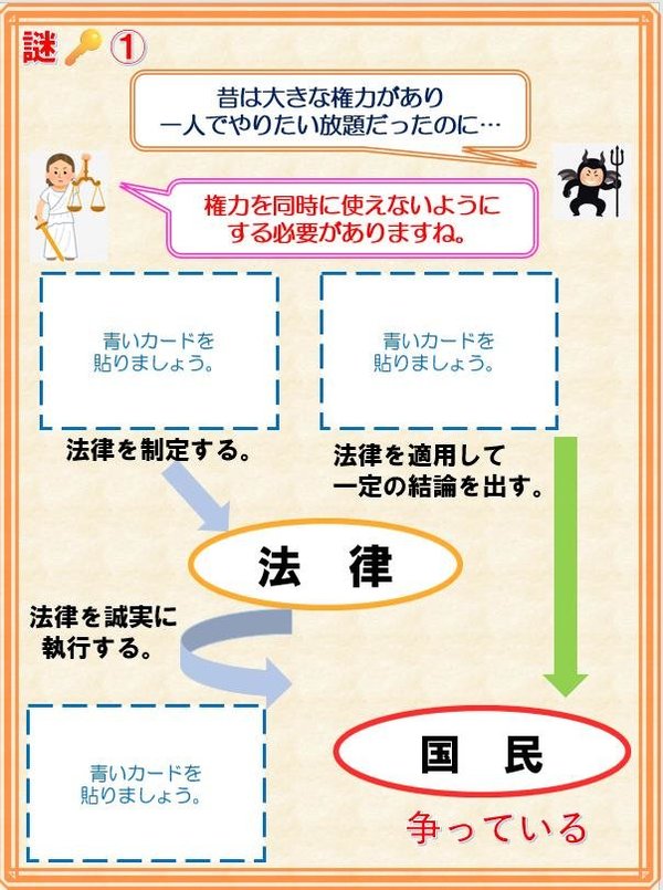 <権力さん>から出される<謎>を解いて進んでいくために必要なものは「憲法条文カード」です。参加者には、合計24枚の憲法条文カードが配られ、このカードを使って、弁護士と一緒に<謎>を解いていきました。