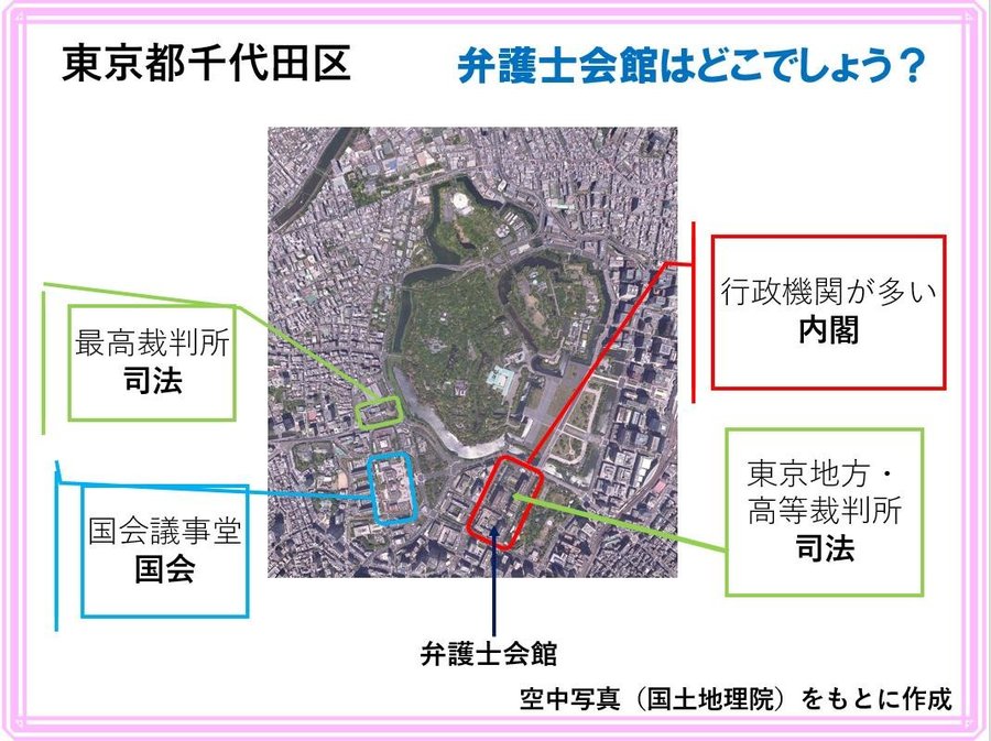 最初に憲法の「導入解説」を受けた後、多くの写真・動画やガイドを視聴しながら、「弁護士会館」を出発し、「東京地方・高等裁判所」→「最高裁判所」→「国会議事堂」→「法務省赤れんが棟」→「検察庁」→「東京家庭裁判所」というルートで進み、途中、弁護士の仕事、民事裁判、刑事裁判、国会や裁判所の役割、家事事件等についての説明も交え、全10問のクイズに挑戦していただきました。
