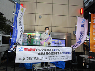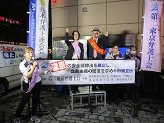 2025年4月11日、第二東京弁護士会主催、日本弁護士連合会、関東弁護士会連合会、東京弁護士会、第一東京弁護士会の共催により、<安全保障関連法を廃止し、立憲主義の回復を目指す>定例街頭宣伝を有楽町駅頭で行いました。雨の中、足を止め、耳を傾けてくださいました市民の皆さま、ありがとうございました。違憲の安保法制の廃止まで、ご支援をよろしくお願いいたします。