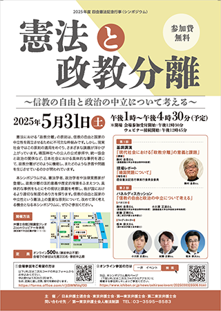 2025年5月31日(土)に開催した四会憲法記念行事シンポジウム「憲法と政教分離~信教の自由と政治の中立について考える~」チラシ(PDF) の様子をYouTubeで2026年7月末まで限定公開しております。ぜひご視聴ください。