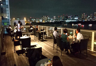 19時に、上田委員長の合図で、いよいよ貸し切り時間が開始しました。東京湾を一望できる抜群のロケーションを誇る、3rdフロアー「フレームカフェ」には、軽食&飲み放題が用意されておりましたので、まずはこちらに向かい、テラスに出て、美しいお台場の夜景を見ながら、グラス片手に、「とりあえず乾杯!」などと楽しまれていた方々も多かったようです。